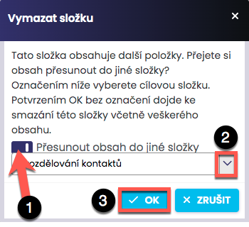 Rovnaký postup ako pre odstránenie štítkov platí aj pre odstránenie priečinka. Iba ak priečinok obsahuje niektoré štítky, systém sa Vás opýta, či si ich želáte presunúť do iného priečinka. Ak áno, zaškrtnite možnosť Presunúť obsah do iného priečinka (1), v rozbaľovacom zozname nižšie vyberte cieľový priečinok (2) a kliknite na OK (3). V prípade, že si želáte odstrániť priečinok aj so štítkami, stačí kliknúť rovno na OK.