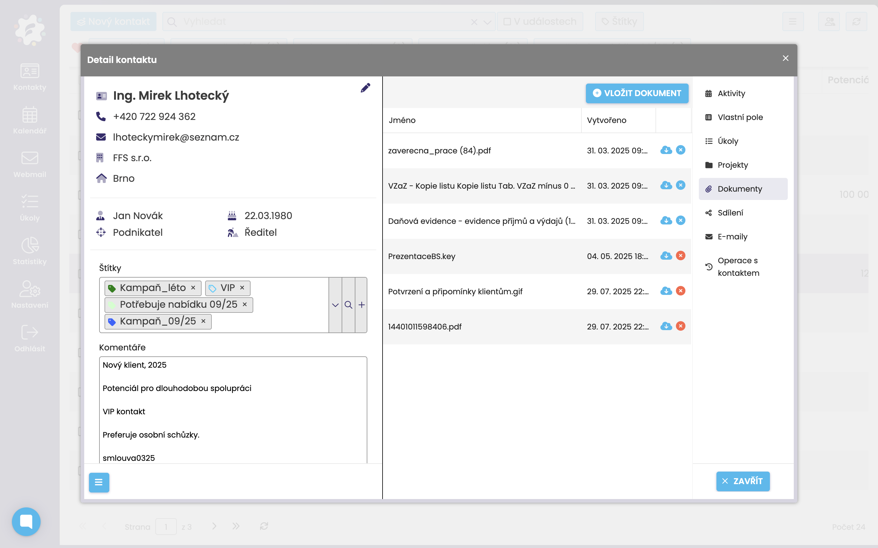 Do dokumentov v karte kontaktu môžete vkladať akékoľvek dokumenty týkajúce sa daného kontaktu. Môžete vkladať akýkoľvek formát – docx, videá, PDF, Excel alebo fotky.