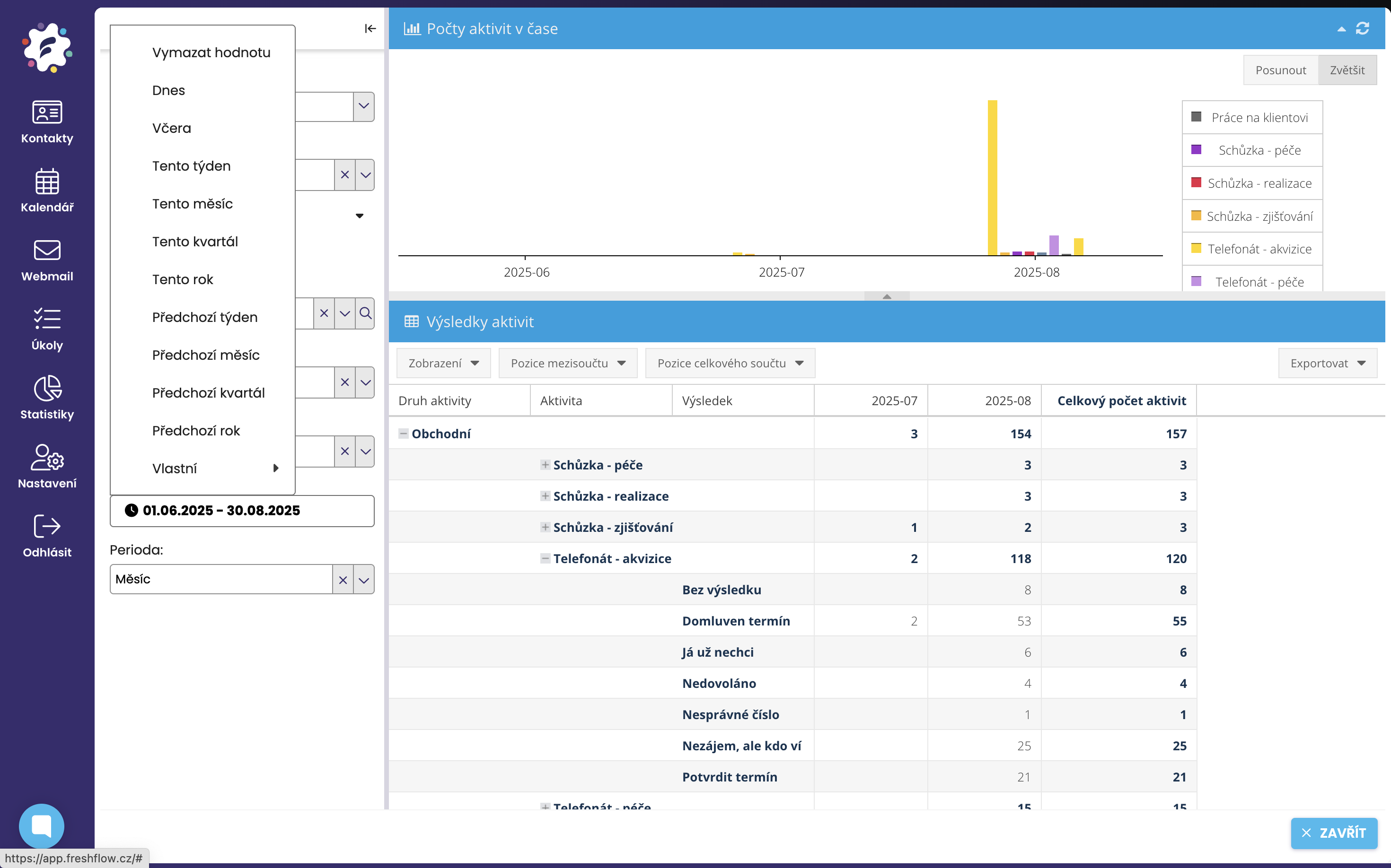 Vďaka zadávaniu vami jasne definovaného okruhu udalostí (stretnutí, telefonátov...) do kalendára dokáže FreshFlow vyhodnocovať počty konkrétnych aktivít.