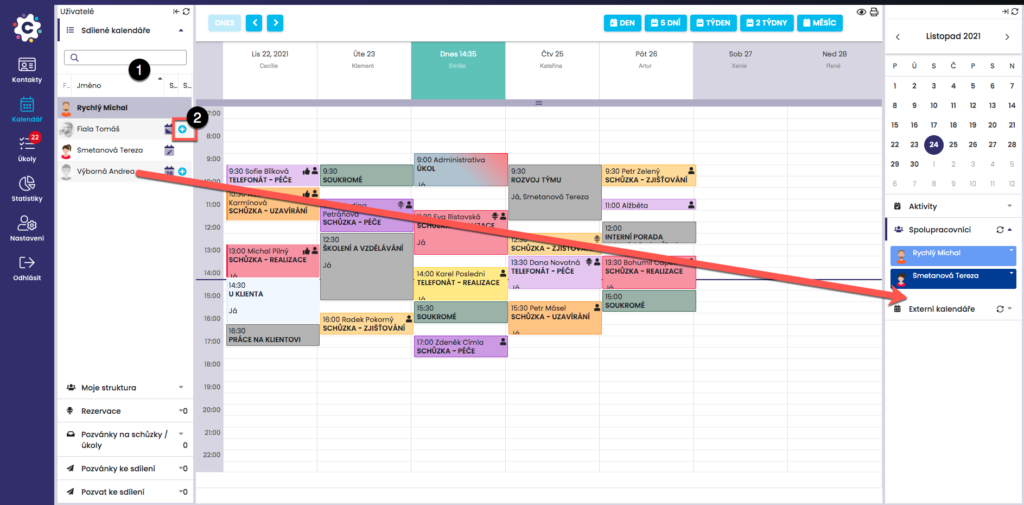 Pomocou drag-and-drop následne presuňte myšou zo záložky Zdieľané kalendáre (1) do pravého menu záložky Spolupracovníci tých, ktorých chcete súčasne zobraziť. Ich kalendáre budú farebne odlíšené. Môžete tiež použiť ikonu + (2), ktorá taktiež pridá používateľa medzi spolupracovníkov.