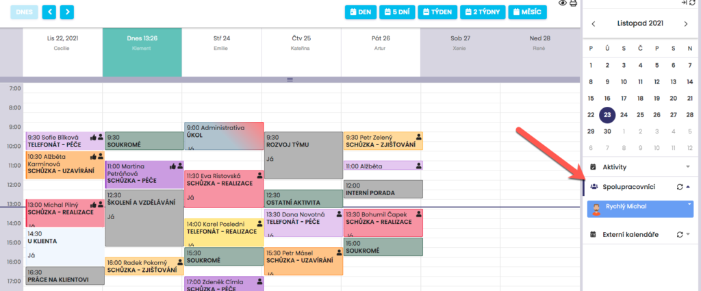 Na zobrazenie viacerých kalendárov, respektíve na prelínanie kalendárov kolegov, najskôr kliknite na záložku Spolupracovníci v pravom menu.