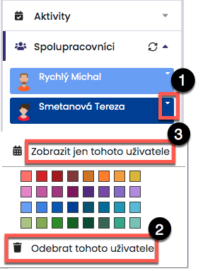 Používateľa je možné zo zoznamu odobrať kliknutím na rozbaľovacie tlačidlo (1) a následne odobrať (2). Je možné tiež zobraziť iba kalendár vybraného používateľa (3). Pomocou palety farieb môžete meniť farbu, ktorou sa daný spolupracovník zobrazí v prekrývaní kalendárov, aby bolo porovnávanie čo najprehľadnejšie.